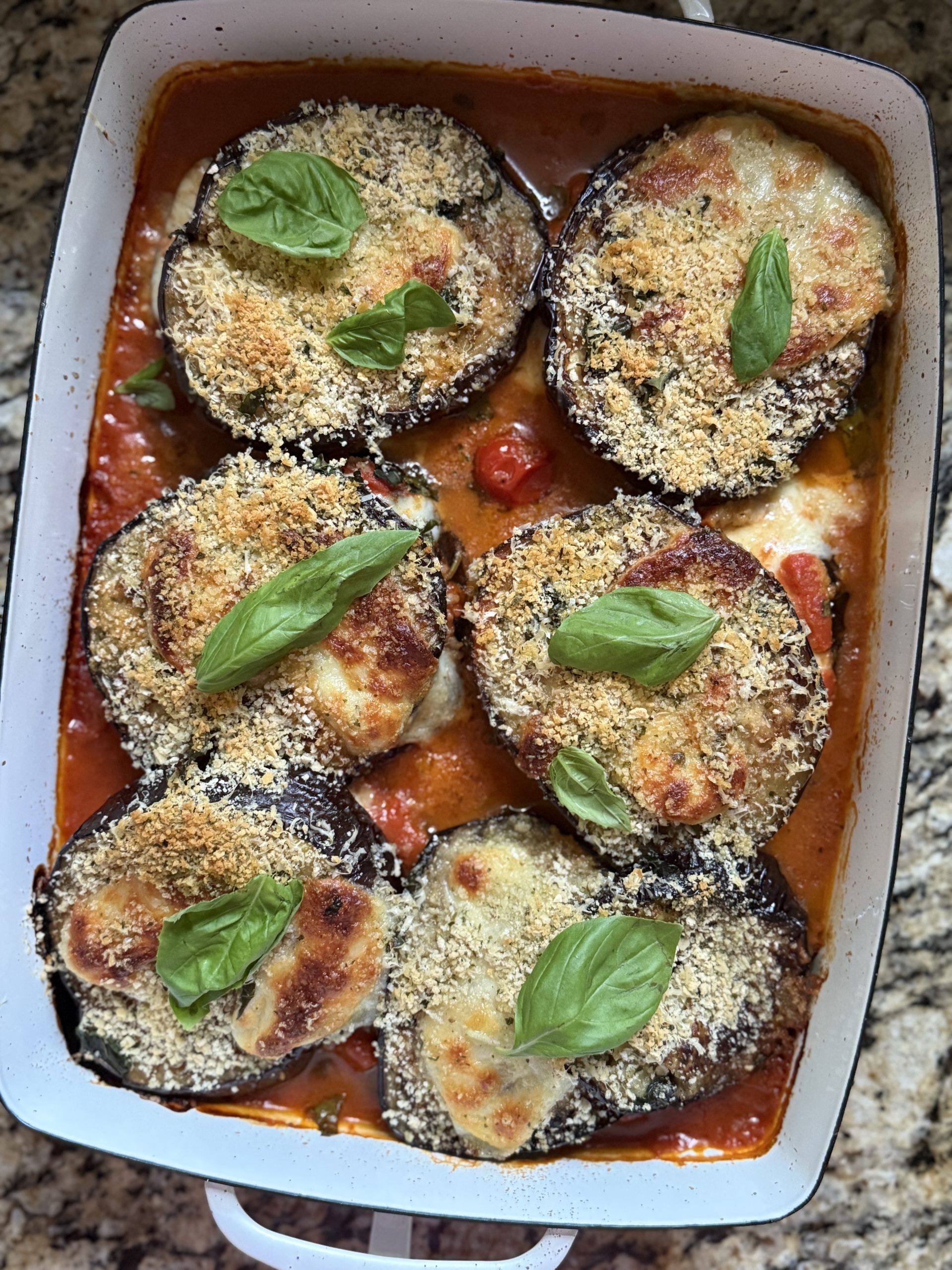 - Spread 1 ½ cups of tomato sauce in the bottom of a 9×13 baking dish. Arrange half the slices in the baking dish. Top evenly with half the mozzarella, torn into chunks, sprinkle ½ cup grated Parmigiano-Reggiano, 1 tablespoon basil, and ½ tsp crushed red pepper. Repeat these layers with the remaining tomato sauce, eggplant, mozzarella, grated Parmigiano-Reggiano, basil, and crushed red pepper. Cover the top layer with breadcrumbs. Bake in the preheated oven for 45 minutes or until the top of the eggplant is golden, breadcrumbs are toasted, and sauce is bubbling. Let it stand for 10min before serving. Garnish with whole fresh basil leaves if you want it to look pretty.