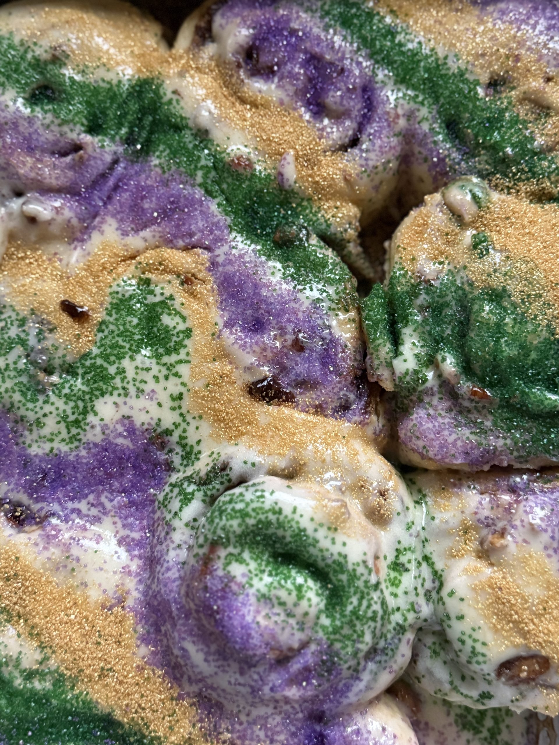 - Once the dough has doubled, punch it down and pat it out into a rectangle. Roll it out into a 18”x12” rectangle with the long side toward you. Spread the filling evenly across the dough, leaving a 1” border on the long edge closest to you. Sprinkle the pecans over the filling. Starting at the long edge farthest from you, roll the dough up in a tight spiral log moving toward you. Pinch at the edge to seal. Using a serrated knife, cut the log into 12 rolls, (about 1 ½” long), and place the rolls in a lightly greased 13”x9” baking pan. Lightly cover with plastic wrap and let rise until puffy and nearly doubled in size, about 30min. Meanwhile, preheat the oven to 400F.