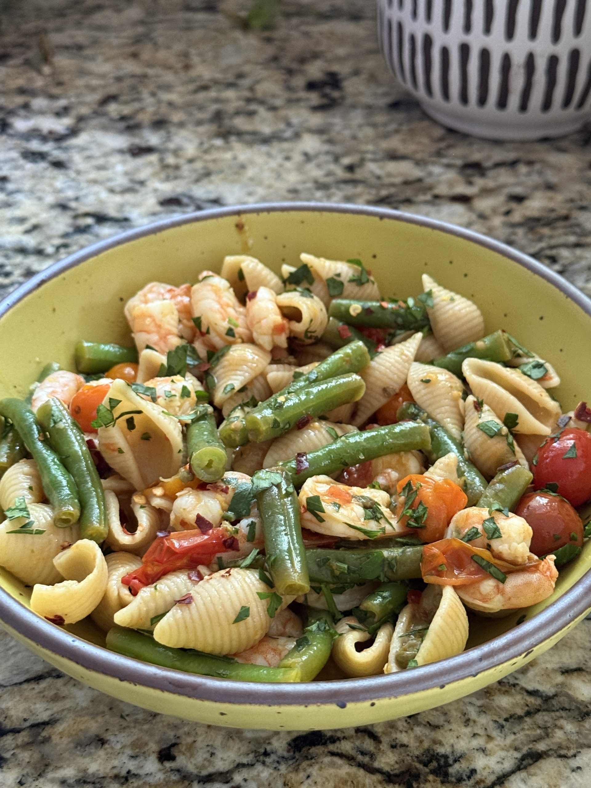 In the vein of our engagement, and my own taste buds, here’s a better shrimp pasta recipe! It’s bright with garlic, lemon, and capers and sweet with summer’s tomatoes and fresh green beans. Best eaten with a chilled glass of unexpectedly red bubbles, and your best friend sitting across from you.
